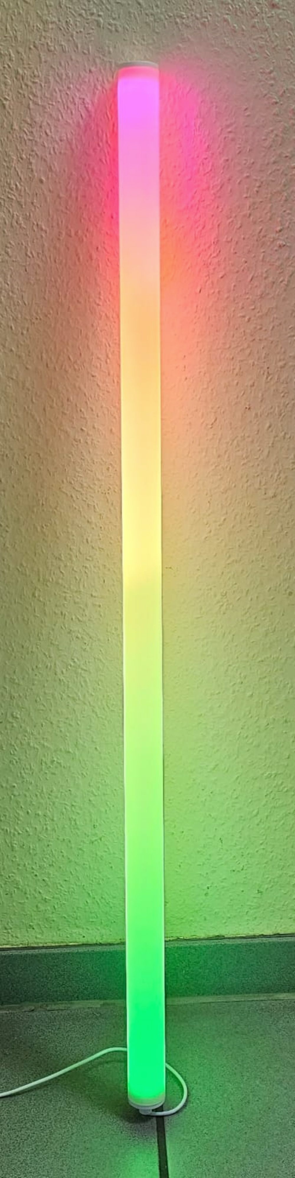 Digitaler LED Leuchtstab mit Smart-Phone Steuerung per APP. Licht in Bewegung und viele Effekte einstellbar. Geliefert wird in einem Kunststoffrohr in MATT mit 1530 mm Länge und Ø 38 mm. Lichtfarbe ist in RGB also mehrfarbig und da jede LED angesteuert werden kann, sind viele Möglichkeiten vorhanden. Die App beinhaltet viele Funktionen und Speicherbare Einstellungen. Das matte Kunststoffrohr ist innen satiniert und sorgt so für eine Homogene Lichtaustritts Fläche. Durch die LED Technik ist hier eine energiesparende Leuchte, mit einer Ersparnis von ca. 60%. Wir liefern auch zwei Klammern aus Acryl-Klarem Kunststoff zur Befestigung an Wand oder Decke. somit kann der LED- Leuchtstab ohne Werkzeug aus dieser Halterung entnommen werden, falls Sie Ihn an einem anderen Ort einsetzen wollen. Das Gewicht ist sehr gering und daher ist die LED Röhre , daher leicht sehr leicht zu montieren.